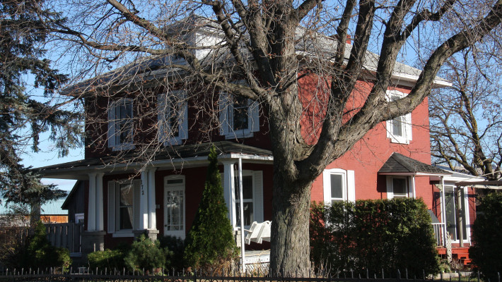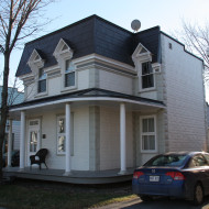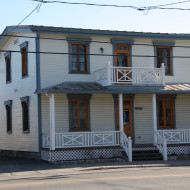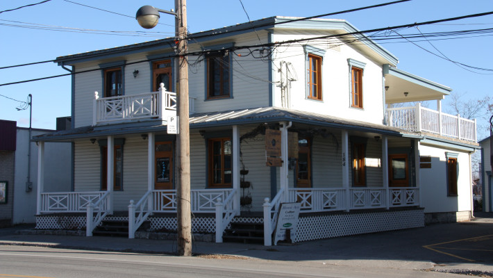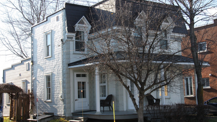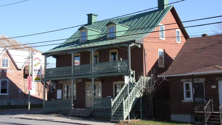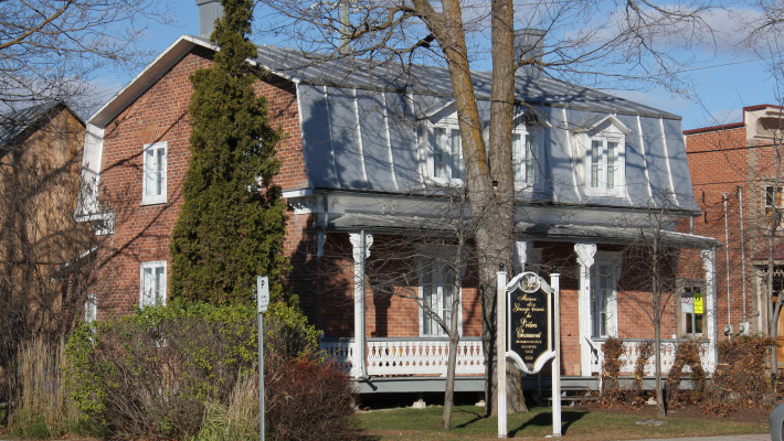 Vraisemblablement construit à la fin du 19e siècle, le 169, boulevard Sainte-Anne n’était à l’origine qu’une modeste maison d’un étage et demi à pignons latéraux. En 1906, Delphis Groulx, alors marchand de bois et propriétaire du plus important moulin à scie de la paroisse, achète la maison. Rappelons le passage de Delphis Groulx à la mairie de Sainte-Anne-desPlaines de 1927 à 1931. À son initiative, on élève le bâtiment d’un étage, on le coiffe d’un toit plat et y on ajoute une cuisine d’été. La maison dans son état actuel date ainsi du début du 20e siècle.