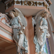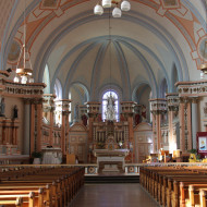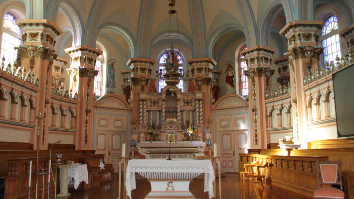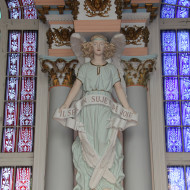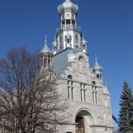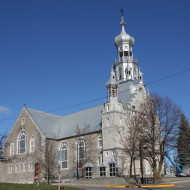 Du sol au sommet de la croix du clocher, l’imposante façade s’élève sur 57,91 m (190 pi). Construite entre 1899 et 1902 selon les plans de l’architecte Joseph Venne, l’église de Sainte-Anne-desPlaines est un édifice d’une exceptionnelle qualité. Avec l’emprunt d’influences stylistiques orientales, la symétrie de sa composition et son ornementation qui évoque la recherche de monumentalité, l’église apparaît comme une fort belle expression de l’éclectisme architectural. Nous prenons plaisir à remarquer quelques-uns des éléments architecturaux, tel le clocher, composé d’un tambour, d’un campanile abritant les cloches et d’une coupole à bulbe qui remplace la flèche habituelle. La façade, caractérisée par son avant-corps central à redents, est flanquée de deux tours latérales coiffées de clochetons. La porte principale, très ouvragée, en bois à double battant est de plus surmontée d’un tympan vitré, impressionnant ouvrage de menuiserie créé par l’architecte Joseph Venne. Prenons quelques instants pour admirer l’intérieur de l’église. L’opulence de l’extérieur se traduit à l’intérieur par un décor richement ornementé d’éléments polychromes, notamment de magnifiques « anges porteurs » – s’inspirant des cariatides − qui supportent les entablements, à la base de la voûte d’ogives. Ces éléments sont purement décoratifs, mais créent l’illusion d’un appui, comme le piédroit des arcs. Ainsi, l’immense voûte semble reposer uniquement sur ces anges. L’usage de ces cariatides est très peu courant dans les églises québécoises. La magnificence de l’église s’explique par l’intention que l’on avait d’en faire un lieu de pèlerinage pour le nord de Montréal, à l’image de Sainte-Anne-de-Beaupré. L’église a été citée monument historique par la Ville en 2004 et a été classée par le Conseil du Patrimoine religieux du Québec dans la catégorie Exceptionnelle B.